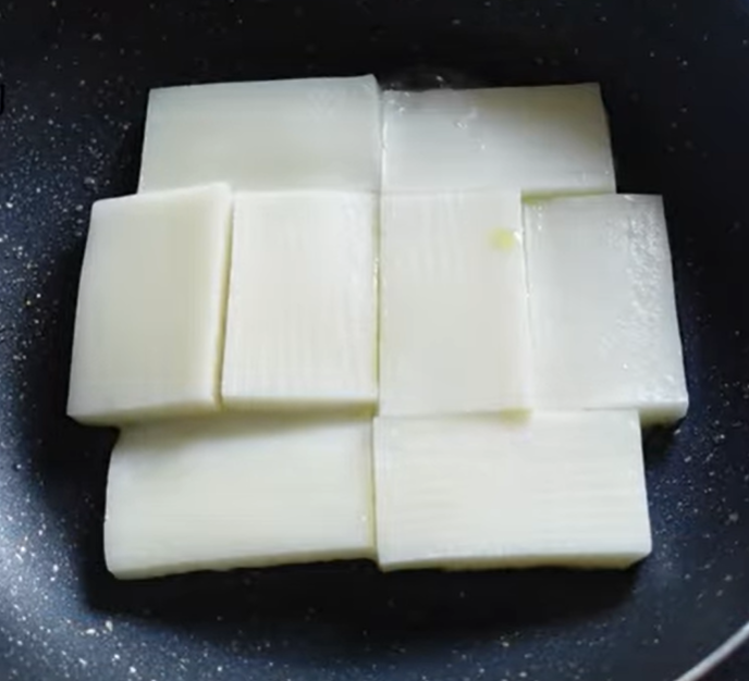 お餅は厚いままでもOKですが、厚みがあるとピザソースが全体に行き渡らず(?)、ちょっと塩気が足りなく感じます。