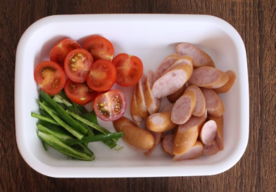 ソーセージ、ハム、サラミ、ピーマン、トマト、玉ねぎなどの具材を切っておきます。