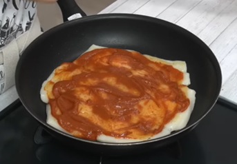 アルミホイルにお餅をのせ(油を塗る必要はありません)、お餅にピザソースを塗ります。