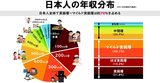 この層は、病気や失業、休職などを何らかのきっかけがあれば、すぐに貧困層に落ちる可能性があります。しかし、年収300万円ぐらいですと、生活はギリギリできてしまうので、問題から目を逸らしてしまいがちです。
